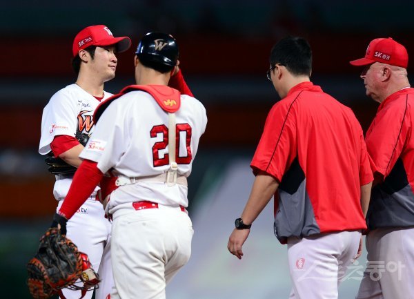22일 인천 SK행복드림구장에서 ‘2017 타이어뱅크 KBO리그’ SK 와이번스와 두산 베어스의 경기가 열렸다. 6회초 무사 1루에서 SK 선발 박종훈이 교체되고 있다.