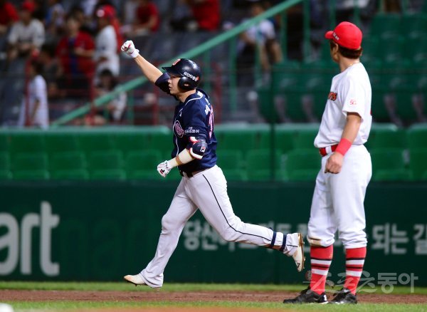 22일 인천 SK행복드림구장에서 ‘2017 타이어뱅크 KBO리그‘ SK 와이번스와 두산 베어스의 경기가 열렸다. 9회초 무사 1루에서 두산 박건우가 SK 김주한을 상대로 우월 역전 투런 홈런을 쏘아 올린 뒤 그라운드를 돌며 환호하고 있다. 인천 | 김민성 기자 marineboy@donga.com