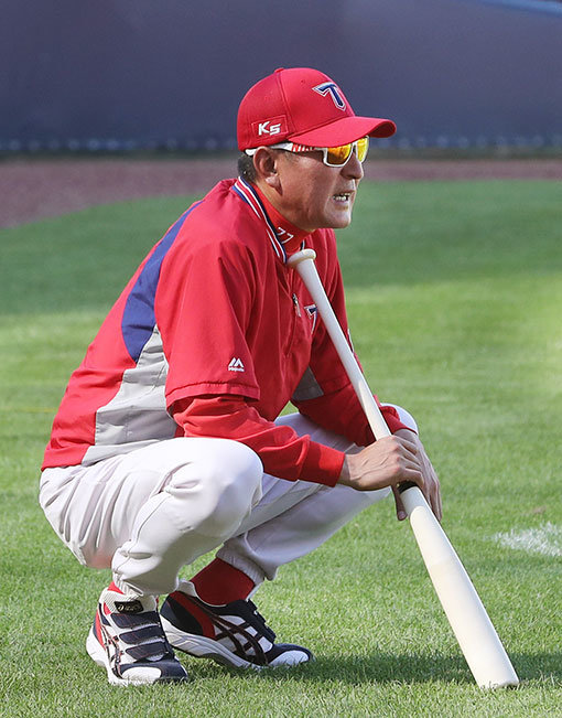 23일 오후 광주 기아-챔피언스필드에서 열리는 ‘2017 프로야구’ KIA 타이거즈와 롯데 자이언츠 경기에 앞서 KIA 김기태 감독이 타격 지도를 하고 있다. 사진제공|스포츠코리아