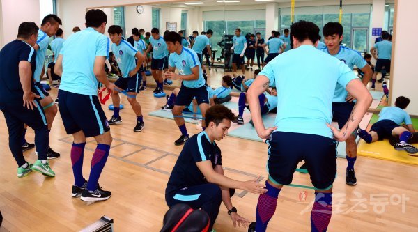 이란(8월 31일), 우즈베키스탄(9월 6일)과 ‘2018 러시아 월드컵’ 아시아지역 최종예선을 앞둔 한국 축구대표팀이 23일 파주국가대표트레이닝센터(NFC)에서 훈련을 가졌다. 축구대표팀 선수들이 부상 방지 프로그램 훈련을 실시하고 있다.