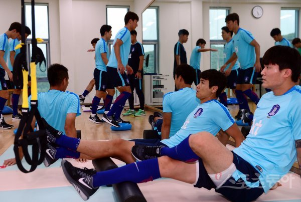 이란(8월 31일), 우즈베키스탄(9월 6일)과 ‘2018 러시아 월드컵’ 아시아지역 최종예선을 앞둔 한국 축구대표팀이 23일 파주국가대표트레이닝센터(NFC)에서 훈련을 가졌다. 축구대표팀 선수들이 부상 방지 프로그램 훈련을 실시하고 있다.