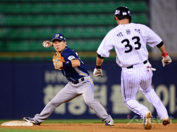 23일 서울 잠실야구장에서 ‘2017 타이어뱅크 KBO 리그 ’NC다이노스와 LG트윈스 경기가 열렸다. 3회말 1사 1루 LG 최재원 내야 땅볼 때 1루주자 박용택 2루에서 포스 아웃되고 있다.