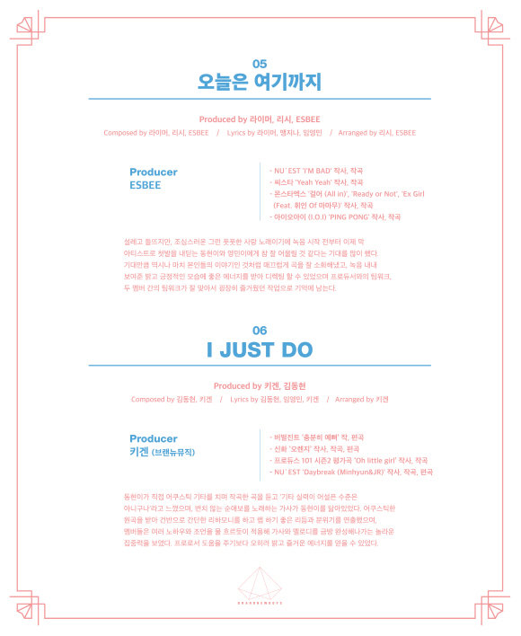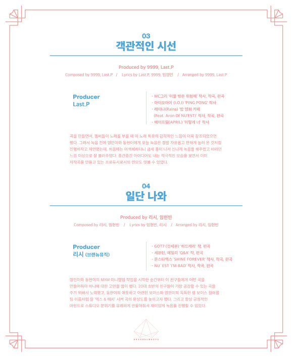 그 중 ‘아이오아이’, ‘MC그리’, ‘AOA지민’ 등의 곡을 프로듀싱 해왔던 프로듀서 9999는 “중간 중간 아이디어를 내는 적극적인 모습을 보면서 프로듀서로서의 면모도 엿볼 수 있었다”며 임영민, 김동현의 음악적 재능에 대해 칭찬했으며, 갓세븐, 세븐틴, 뉴이스트, 몬스타엑스 등의 곡을 프로듀싱했던 리시는 “팀 이름처럼 잘 ‘믹스&매치’ 시켜 곡의 완성도를 높였고, 긍정적인 마인드로 스튜디오를 유쾌하게 만들었다.”라는 애정어린 코멘터리를 달아 이번 앨범에 대한 궁금증을 증폭시켰다.