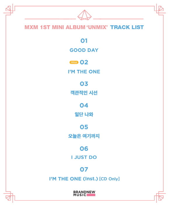 지난 23일, 브랜뉴보이즈의 공식 SNS에 공개된 트랙리스트로 마침내 베일을 벗은 MXM의 첫 번째 미니앨범 ’UNMIX’는 타이틀곡 ‘I’M THE ONE’을 포함한 수록곡 ‘GOOD DAY’, ‘객관적인 시선’, ‘일단 나와’, ‘오늘은 여기까지’, ‘I JUST DO’ 을 포함, 총 6곡으로 구성되어 있다.