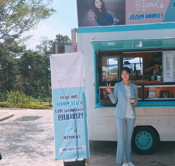 사진 속에는 커피차 선물을 받고 한없이 밝은 표정을 보이는 공승연의 모습이 담겼다. 공승연은 맑은 하늘을 연상케 하는 하늘색 슈트를 빼입고 성숙한 여인의 매력을 발산했다. 함께 공개된 커피차에는 “무더운 여름, 시원한 음료로 더위 날려버리시고, 힘내세요! 대박을 기원합니다”라는 응원의 메시지가 담겨있어 훈훈함을 자아냈다.