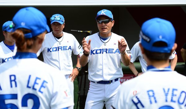 25일 경기도 이천 LG 챔피언스파크에서 ‘제 3회 LGㅇ컵 국제여자야구대회 2017’가 개막했다. 한국이 홍콩에 9-8로 승리한 뒤 동봉철 감독이 선수들을 격려하고 있다.
