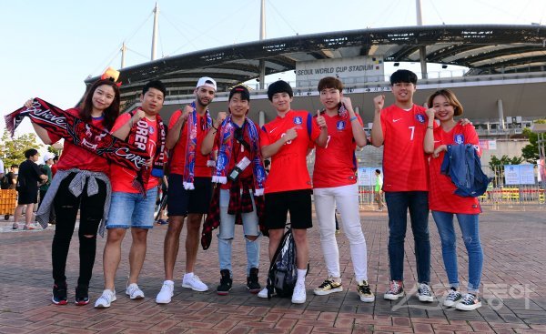 31일 서울 상암 월드컵경기장에서 ‘2018 러시아월드컵’ 한국과 이란의 아시아지역 최종예선 경기가 열린다. 축구팬들이 붉은 티셔츠를 입고 응원을 펼치고 있다.