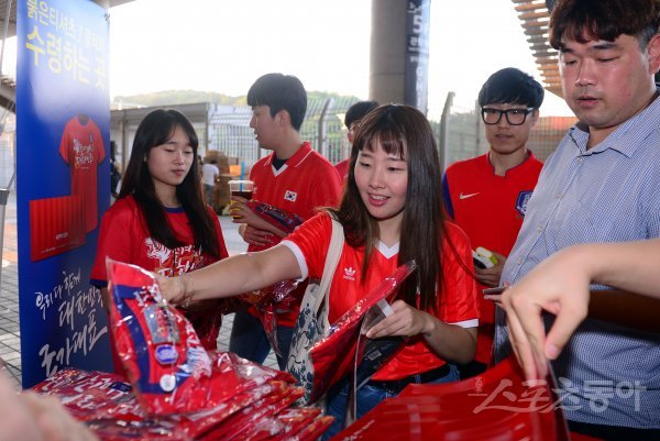 31일 서울 상암 월드컵경기장에서 ‘2018 러시아월드컵’ 한국과 이란의 아시아지역 최종예선 경기가 열린다. 축구협회가 경기에 앞서 붉은 티셔츠 6만여장을 축구팬들에게 배포하고 있다.