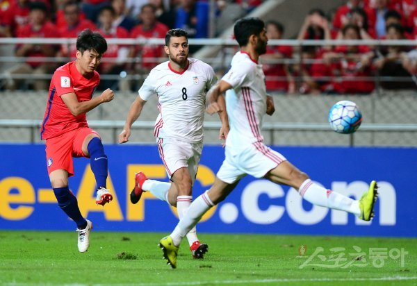 31일 서울 상암 월드컵경기장에서 ‘2018 러시아월드컵’ 한국과 이란의 아시아지역 최종예선 경기가 열렸다. 축구 대표팀 김진수가 슛을 날리고 있다.