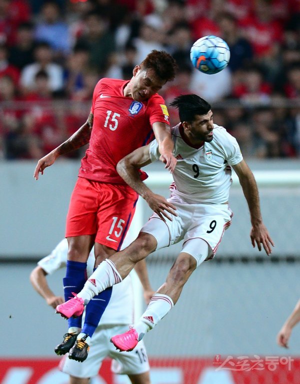 31일 서울 상암 월드컵경기장에서 ‘2018 러시아월드컵’ 한국과 이란의 아시아지역 최종예선 경기가 열렸다. 축구 대표팀 장현수가 이란 선수와 공중볼을 다투고 있다.