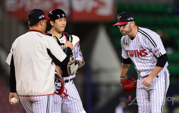 1일 서울 잠실야구장에서 ‘2017 타이어뱅크 KBO리그’ LG트윈스와 넥센히어로즈의 경기가 열렸다. 6회초 2사 LG 선발 허프가 교체되면서 강상수 투수코치(왼쪽)에게 머리 숙여 인사를 하고 있다.