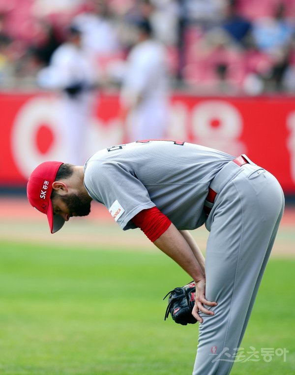 3일 경기도 수원 kt위즈파크에서 ‘2017 타이어뱅크 KBO리그’ kt 위즈와 SK 와이번스의 경기가 열렷다. 3회말 2사 1, 3루에서 kt 박기혁에게 적시타를 허용한 SK 선발 다이아몬드가 아쉬워하고 있다.