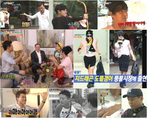 이어 ‘新 3G’팀은 없는 것 빼고 다 있다는 ‘서울 풍물시장’으로 향했다. 준호-종민-동구는 15분 안에 사진 속 GD의 패션과 똑같이 옷을 입는 미션을 수행했다. ‘쇼핑왕’ 준호는 상인들에게 질문을 하면서 가격도 깎는 등 순조롭게 물품 구입을 진행한 반면, ‘삑구’ 동구는 한여름에 비니 모자를 찾기 위해 시장 이곳 저곳을 헤매는 등 대비되는 모습을 보여 웃음을 선사했다. 그러나 동구의 변신 모습은 모두를 깜짝 놀라게 했다. 종민은 ‘진짜 똑같다! 완전 동드래곤이다!”라며 지드래곤과의 싱크로율에 감탄했다.