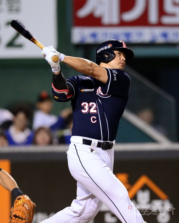 6일 대전 한화생명이글스파크에서 ‘2017 타이어뱅크 KBO 리그’ 두산베어스와 한화이글스 경기가 열렸다. 2회초 무사 두산 김재환이 우월 솔로 홈런을 날리고 있다.