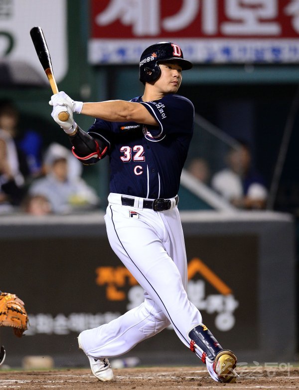 6일 대전 한화생명이글스파크에서 ‘2017 타이어뱅크 KBO 리그’ 두산베어스와 한화이글스 경기가 열렸다. 3회초 무사 1루 두산 김재환이 우전 안타를 치고 있다.