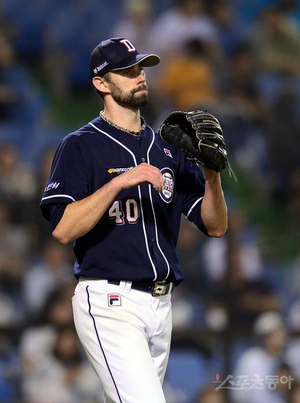 6일 대전 한화생명이글스파크에서 ‘2017 타이어뱅크 KBO 리그’ 두산베어스와 한화이글스 경기가 열렸다. 선발 투수로 등판한 두산 니퍼트가 4회말 2사 1,2루 한화 양성우에게 1타점 우전 안타을 허용한 후 아쉬워하고 있다.