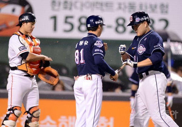 6일 대전 한화생명이글스파크에서 ‘2017 타이어뱅크 KBO 리그’ 두산베어스와 한화이글스 경기가 열렸다. 6회초 무사 두산 오재일이 동점을 만드는 우월 솔로 홈런을 날리고 그라운드를 돌아 홈인해 하이파이브 하고 있다.