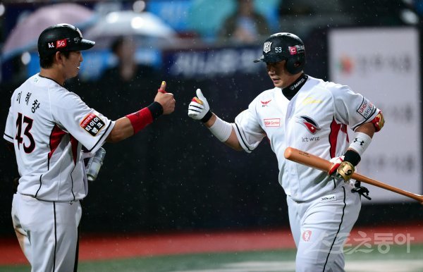 6일 경기도 수원 kt위즈파크에서 ‘2017 타이어뱅크 KBO리그’ kt 위즈와 넥센 히어로즈의 경기가 열렸다. 8회말 2사에서 kt 박경수가 넥센 이보근을 상대로 우월 솔로 홈런을 쏘아 올린 뒤 이해창과 하이파이브를 나누고 있다.