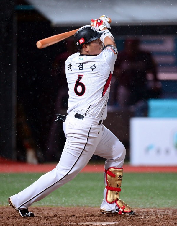 6일 경기도 수원 kt위즈파크에서 ‘2017 타이어뱅크 KBO리그’ kt 위즈와 넥센 히어로즈의 경기가 열렸다. 8회말 2사에서 kt 박경수가 넥센 이보근을 상대로 우월 솔로 홈런을 쏘아 올리고 있다.