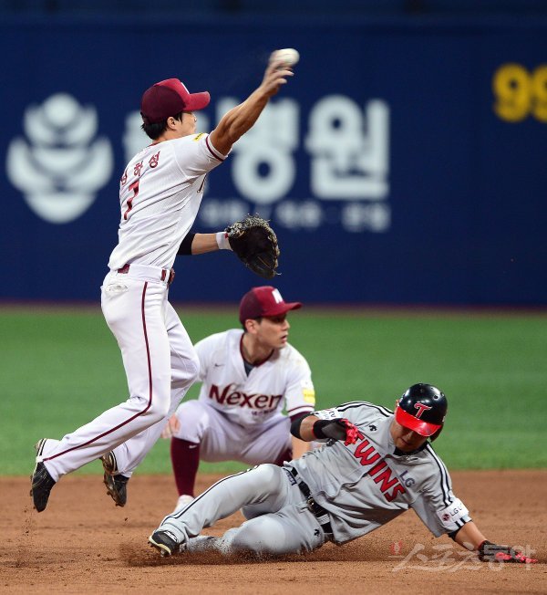 7일 서울 고척스카이돔에서 ‘2017 타이어뱅크 KBO 리그’ 넥센히어로즈와 LG트윈스의 경기가 열렸다. 8회초 1사 1,2루에서 넥센 유격수 김하성이 LG 백창수의 2루수 앞 땅볼에서 2루로 향하는 정주현을 포스아웃 시킨 후 1루로 송구하며 병살 플레이를 만들었다. LG측 요청으로 비디오 판독이 시행됐지만 원심 그대로 인정됐다.