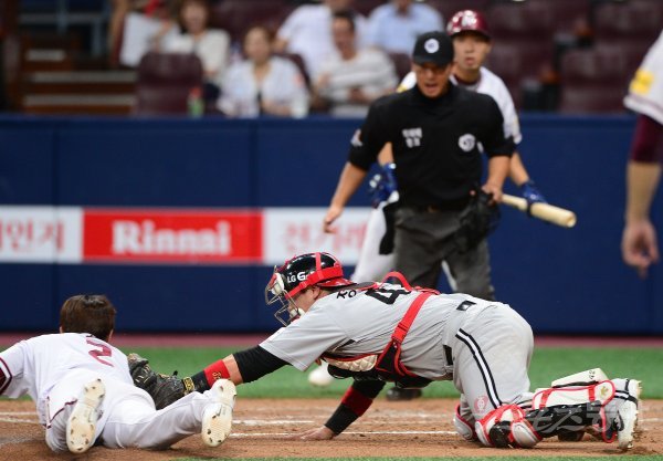 8일 서울 고척스카이돔에서 ‘2017 타이어뱅크 KBO 리그’ 넥센히어로즈와 LG트윈스의 경기가 열렸다. 2회말 2사 1,2루에서 LG 포수 정상호가 넥센 이정후의 적시타 때 홈으로 쇄도하는 주효상(왼쪽)을 태그아웃 시키고 있다.
