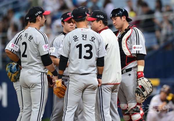 8일 서울 고척스카이돔에서 ‘2017 타이어뱅크 KBO 리그’ 넥센히어로즈와 LG트윈스의 경기가 열렸다. 7회말 1사 1,2루에서 LG 양상문 감독이 마운드에 올라가 내야 수비들을 불러 모아놓고 작전을 지시하고 있다.