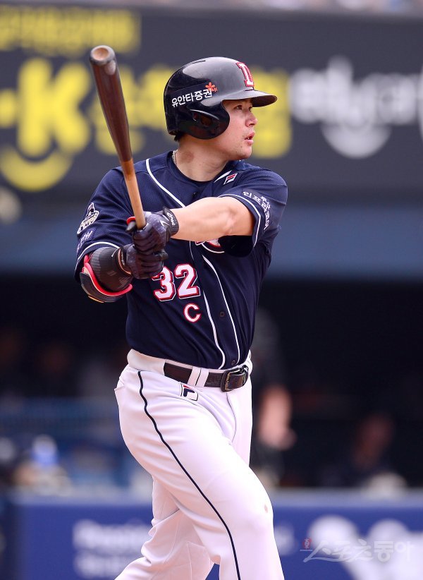10일 서울 잠실야구장에서 ‘2017 타이어뱅크 KBO 리그’ 두산베어스와 LG트윈스 경기가 열렸다. 3회초 1사 만루 두산 김재환이 역전 싹쓸이 3타점 우중간 2루타를 치고 있다.