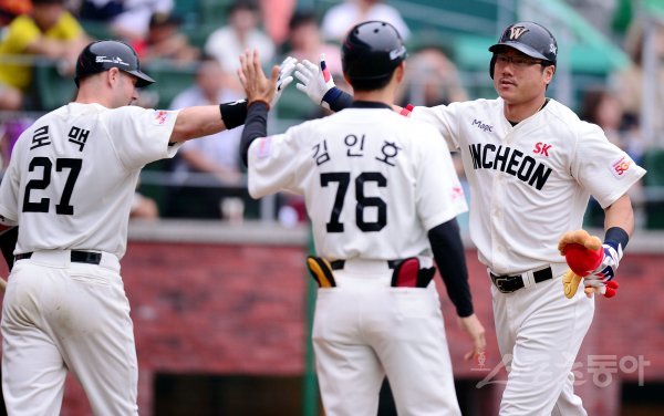 10일 인천 SK행복드림구장에서 ‘2017 타이어뱅크 KBO리그’ SK 와이번스와 넥센 히어로즈의 경기가 열렸다. 8회말 2사에서 SK 박정권이 넥센 김건태를 상대로 중월 솔로 홈런을 쏘아 올린 뒤 동료들의 환영을 받고 있다.