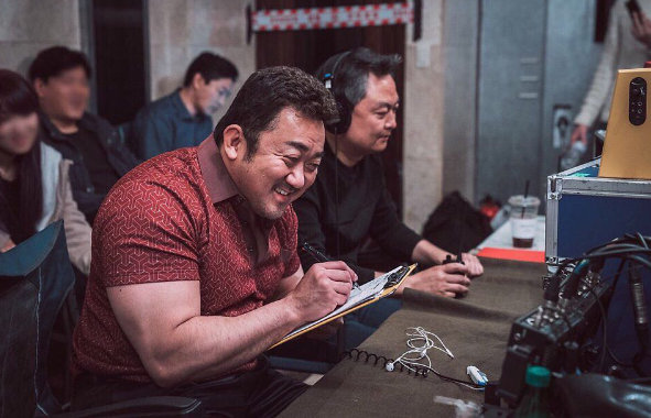 공개된 사진 속 마동석은 실제로 촬영 현장에서 스크립 페이퍼를 작성하고 있다. 빨간색 셔츠에 터질 듯한 팔 근육이 인상적이다. 마동석은 다소 어울리지 않는 모습이지만 환하게 웃는 미소를 뽐냈다.
