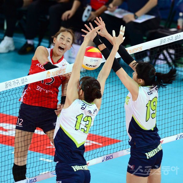 13일 천안유관순체육관에서 ‘2017 천안·넵스컵 프로배구대회’ 여자부 B조 현대건설과 KGC인삼공사 경기에서 KGC인삼공사 한송이가 현대건설의 블로킹 사이로 스파이크 공격을 하고 있다.