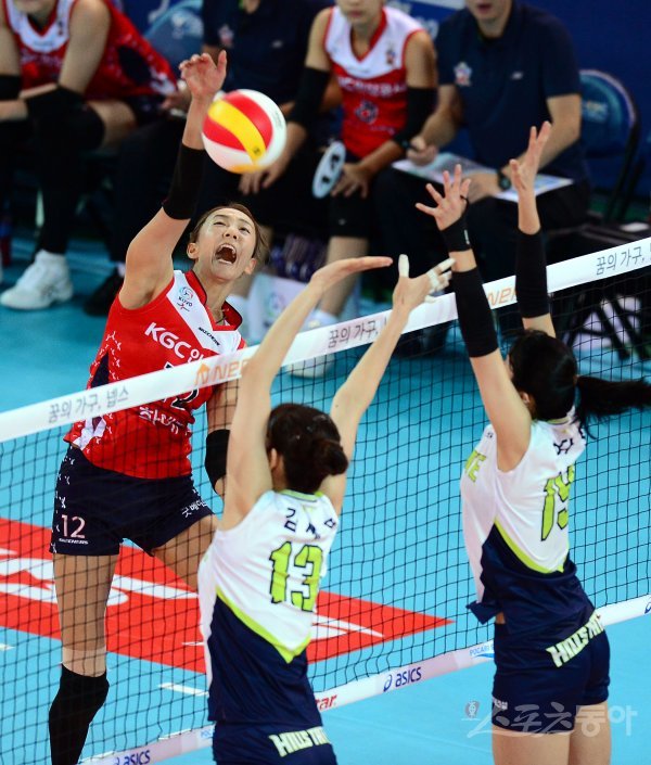 13일 천안유관순체육관에서 ‘2017 천안·넵스컵 프로배구대회’ 여자부 B조 현대건설과 KGC인삼공사 경기에서 KGC인삼공사 한송이가 현대건설의 블로킹 사이로 스파이크 공격을 하고 있다.