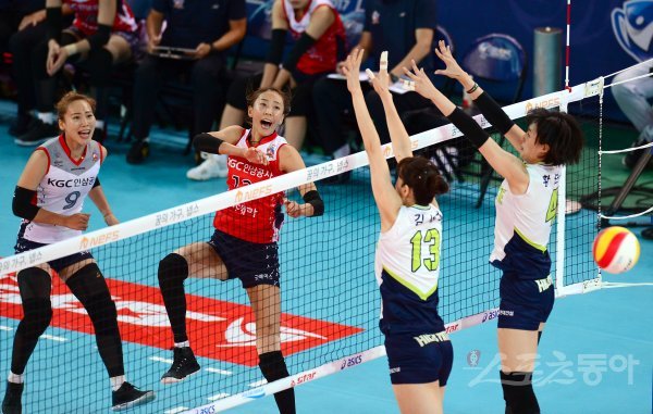 13일 천안유관순체육관에서 ‘2017 천안·넵스컵 프로배구대회’ 여자부 B조 현대건설과 KGC인삼공사 경기에서 KGC인삼공사 한송이가 현대건설의 블로킹 사이로 스파이크 공격을 하고 있다.