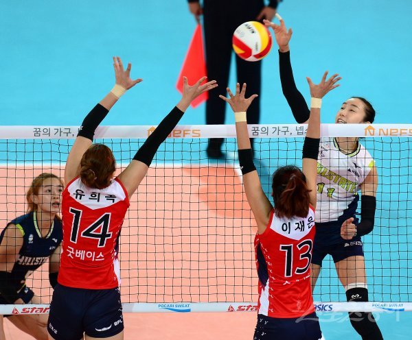 13일 천안유관순체육관에서 ‘2017 천안·넵스컵 프로배구대회’ 여자부 B조 현대건설과 KGC인삼공사 경기에서 현대건설 한유미가 KGC인삼공사의 블로킹 사이로 스파이크 공격을 하고 있다.