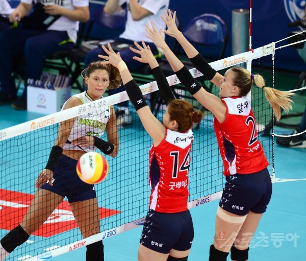 13일 천안유관순체육관에서 ‘2017 천안·넵스컵 프로배구대회’ 여자부 B조 현대건설과 KGC인삼공사 경기에서 현대건설 엘리자베스가 KGC인삼공사의 블로킹 사이로 스파이크 공격을 하고 있다.
