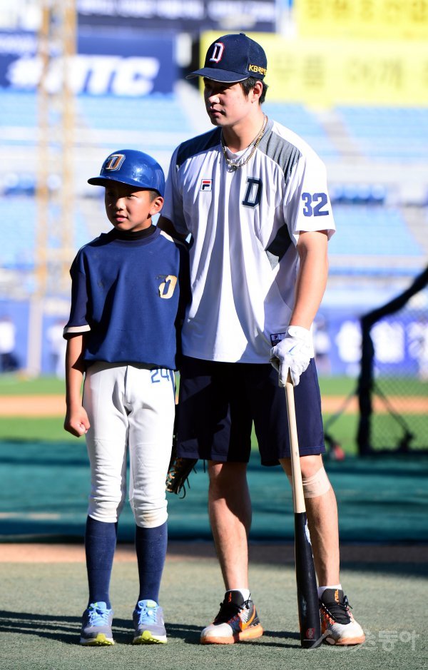 13일 창원 마산야구장에서 ‘2017 타이어뱅크 KBO리그’ NC 다이노스와 두산 베어스의 경기가 열린다. 경기전 두산 김재환이 야구 선수를 꿈꾸는 어린이와 이야기를 나누고 있다.