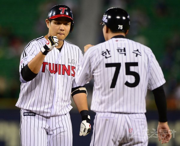 13일 서울 잠실야구장에서 ‘2017 타이어뱅크 KBO리그’ LG트윈스와 롯데자이언츠의 경기가 열렸다. 3회말 2사 1,3루에서 LG 김재율이 2타점 적시타를 친 후 한혁수 코치의 축하를 받고 있다.