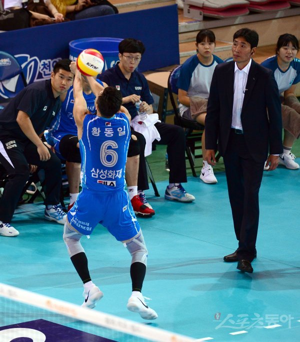 13일 천안유관순체육관에서 ‘2017 천안·넵스컵 프로배구대회’ 남자부 A조 대한항공과 삼성화재 경기에서 삼성화재 황동일이 벤치 앞까지 달려가 리시브 하자 신진식 감독이 바라보고 있다.