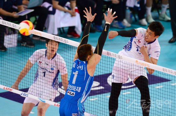 13일 천안유관순체육관에서 ‘2017 천안·넵스컵 프로배구대회’ 남자부 A조 대한항공과 삼성화재 경기에서 대한항공 진성태가 삼성화재의 블로킹 사이로 스파이크 공격을 하고 있다.