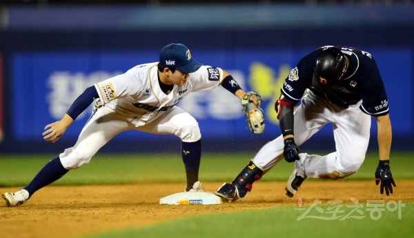13일 창원 마산야구장에서 ‘2017 타이어뱅크 KBO리그’ NC 다이노스와 두산 베어스의 경기가 열렸다. 3회초 무사에서 두산 김재환이 2루타를 치고 난 뒤 세이프되고 있다.