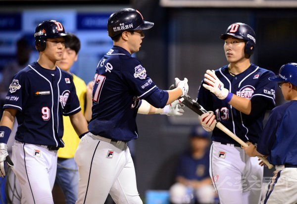 13일 창원 마산야구장에서 ‘2017 타이어뱅크 KBO리그’ NC 다이노스와 두산 베어스의 경기가 열렸다. 3회초 2사 1, 2루에서 두산 박건우가 NC 정수민을 상대로 좌월 3점 홈런을 쏘아 올린 뒤 동료들의 환영을 받고 있다.