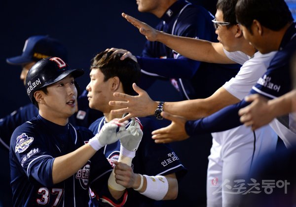 13일 창원 마산야구장에서 ‘2017 타이어뱅크 KBO리그’ NC 다이노스와 두산 베어스의 경기가 열렸다. 3회초 2사 1, 2루에서 두산 박건우가 NC 정수민을 상대로 좌월 3점 홈런을 쏘아 올린 뒤 동료들의 환영을 받고 있다.