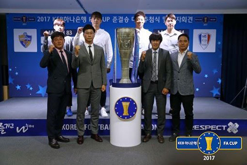프로와 아마를 통틀어 국내 축구의 최강자를 가리는 FA컵 준결승 대진이 결정됐다. 대한축구협회는 9월 13일 서울 신문로 축구회관에서‘2017 KEB하나은행 FA컵’ 준결승 대진추첨식과 기자회견을 했다. 대진추첨 결과 FA컵 준결승은 울산현대(K리그 클래식)-목포시청(내셔널리그), 부산아이파크(K리그 챌린지)-수원삼성(K리그 클래식)의 대결로 압축됐다. FA컵 정상에 오르는 팀에게는 3억원의 우승상금과 아시아축구연맹(AFC) 챔피언스리그 출전자격을 준다. 결승 길목에서 마주친 4팀 감독과 선수들은 승리를 다짐했다.