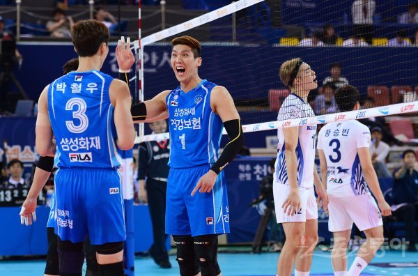 13일 천안유관순체육관에서 ‘2017 천안·넵스컵 프로배구대회’ 남자부 A조 대한항공과 삼성화재 경기에서 삼성화재 김규민이 공격 득점에 성공한 후 기뻐하고 있다.