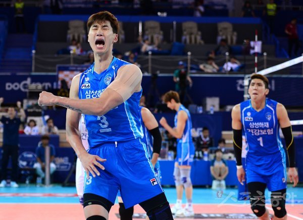 13일 천안유관순체육관에서 ‘2017 천안·넵스컵 프로배구대회’ 남자부 A조 대한항공과 삼성화재 경기에서 삼성화재 박철우가 공격 득점에 성공한 후 기뻐하고 있다.