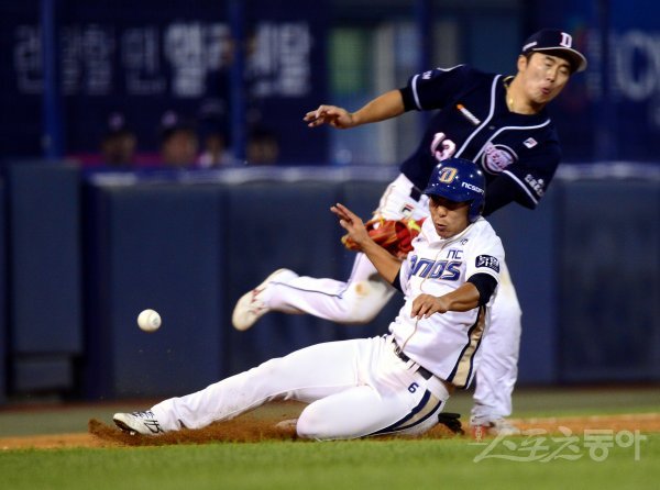 13일 창원 마산야구장에서 ‘2017 타이어뱅크 KBO리그’ NC 다이노스와 두산 베어스의 경기가 열렸다. 8회말 2사 1루에서 NC 도태훈의 안타 때 1루 주자 황윤호가 3루까지 진루하고 있다.