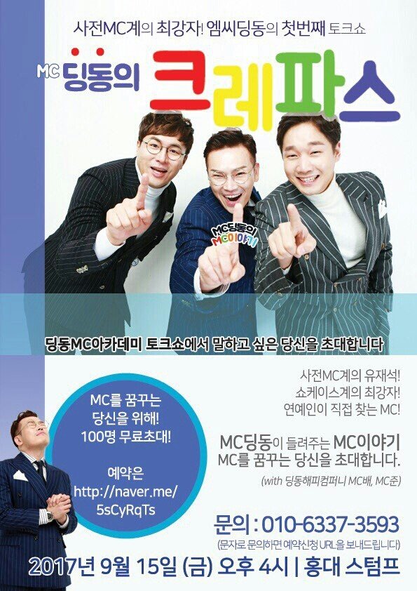 이번 토크쇼는 MC딩동이 데뷔 후 10년 만에 처음으로 진행하는 단독 토크쇼로, MC 지망생들에게 MC딩동만의 진행 노하우와 본인의 진솔한 이야기를 들려주는 자리가 될 예정이다.