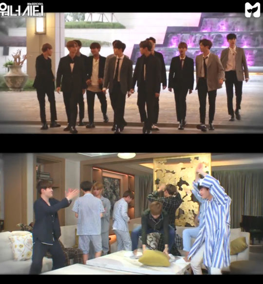 공개된 영상에는 워너원 완전체 강다니엘 박지훈 황민현 윤지성 옹성우 김재환 배진영 이대휘 하성운 박우진 라이관린이 인천 영종도 P 호텔에 멋진 수트 차림으로 입성하면서 시작된다.