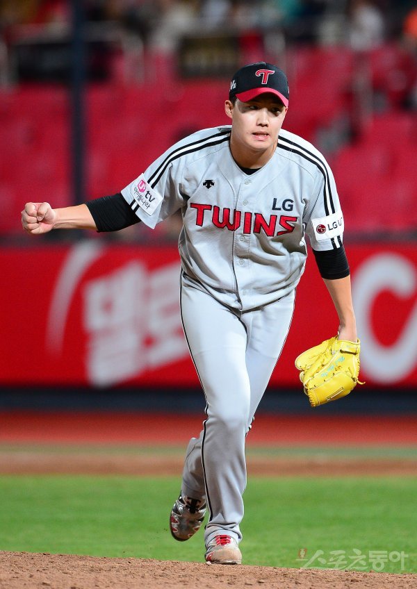15일 경기도 수원 kt위즈파크에서 ‘2017 타이어뱅크 KBO리그’ kt위즈와 LG트윈스의 경기가 열렸다. 5회말 2사 3루에서 LG 선발 임찬규가 kt 김진곤을 삼진으로 잡은 후 주먹을 불끈 쥐며 기뻐하고 있다.