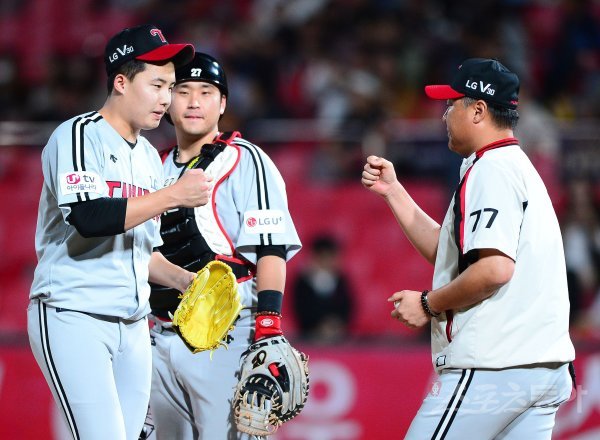 15일 경기도 수원 kt위즈파크에서 ‘2017 타이어뱅크 KBO리그’ kt위즈와 LG트윈스의 경기가 열렸다. 6회말 1사 1루에서 LG 선발 임찬규가 교체되고 있다. 이날 임찬규는 개인 최다인 탈삼진 10개를 잡아냈다.