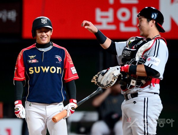15일 경기도 수원 kt위즈파크에서 ‘2017 타이어뱅크 KBO리그’ kt위즈와 LG트윈스의 경기가 열렸다. 9회말 1사 1루에서 kt 심재민의 2루 도루에 대한 비디오 판독 중 하준호와 LG 포수 유강남이 대화를 나누고 있다.